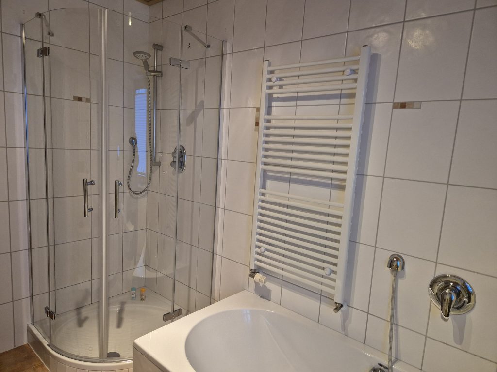 - Badezimmer mit Dusche, Badewanne, Handtüchern und Fön